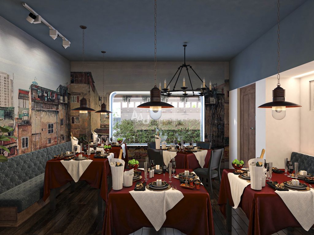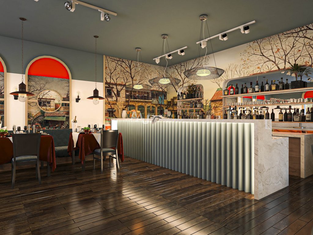 Là phong cách thể hiện rõ nhất sự tinh tế cùng vẻ chuyên nghiệp, đầy thu hút của một nhà hàng kiểu Âu, nội thất cổ điển trong bản thiết kế nhà hàng Saigon Chef’s không quá hào nhoáng như cách chúng xuất hiện ở không gian nhà ở. Ngược lại, kiến trúc sư AAU đã hòa chút gia vị đồng quê thông qua tranh vẽ trên tường cùng những thiết kế đèn thả cổ điển, để mẫu thiết kế nhà hàng đẹp thích hợp với thị hiếu của khách hàng Việt.