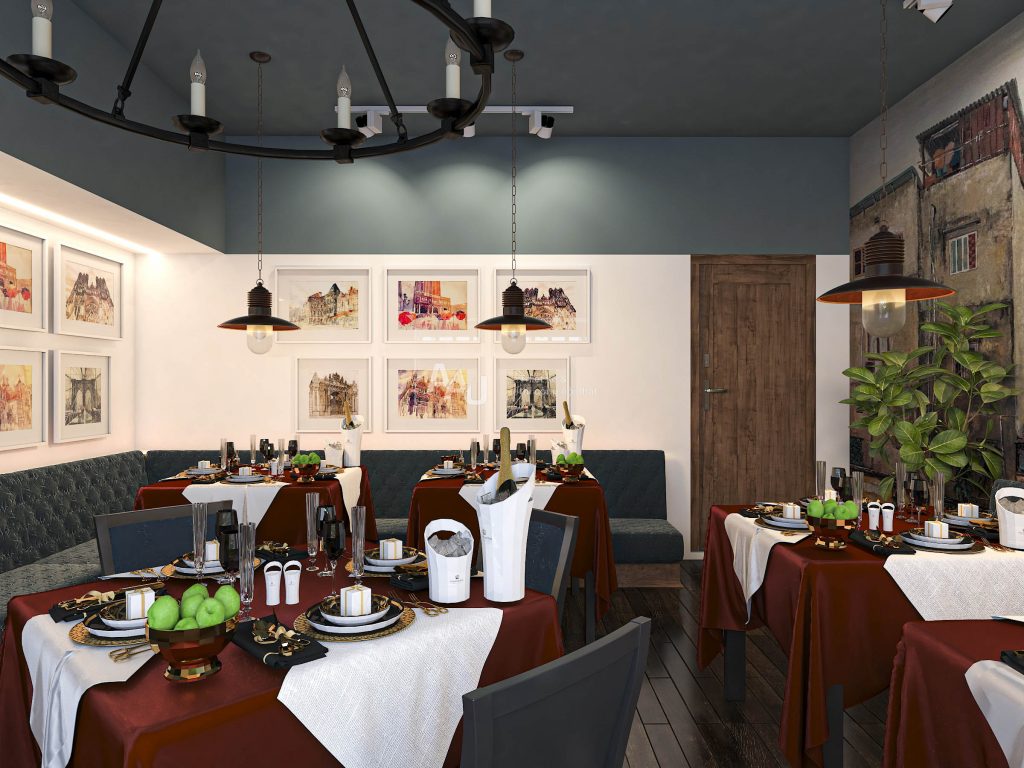 Chất liệu gỗ và nhung được sử dụng để góp phần truyền tải đúng không khí trang trọng của một dự án thiết kế nhà hàng phong cách đồng quê kiểu Âu. Đặc điểm chia tách rõ ràng của bố cục thiết kế còn được biểu hiện qua việc sắp xếp bàn ăn đối xứng – Yếu tố quan trọng khi nhắc đến phong cách cổ điển.