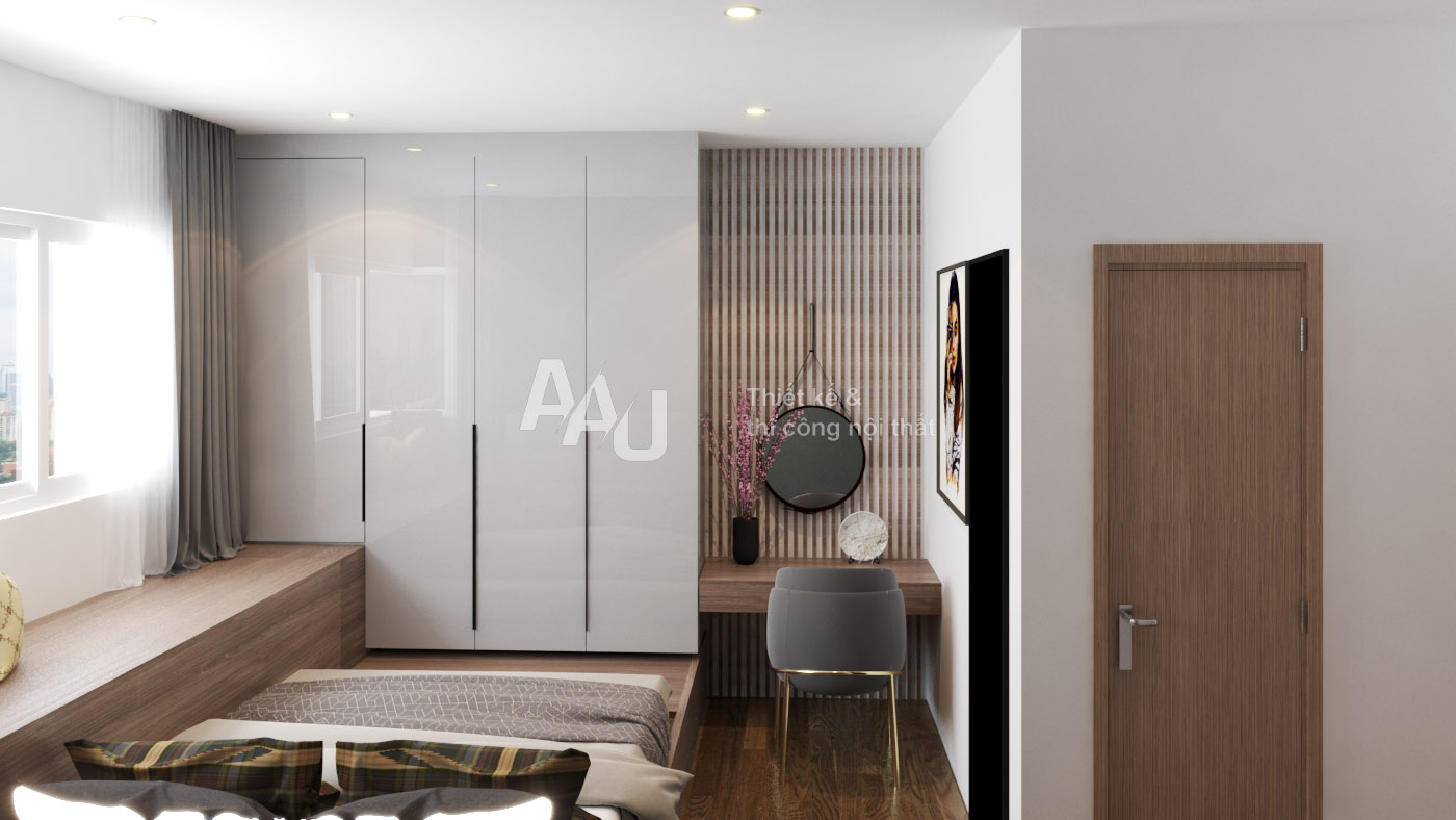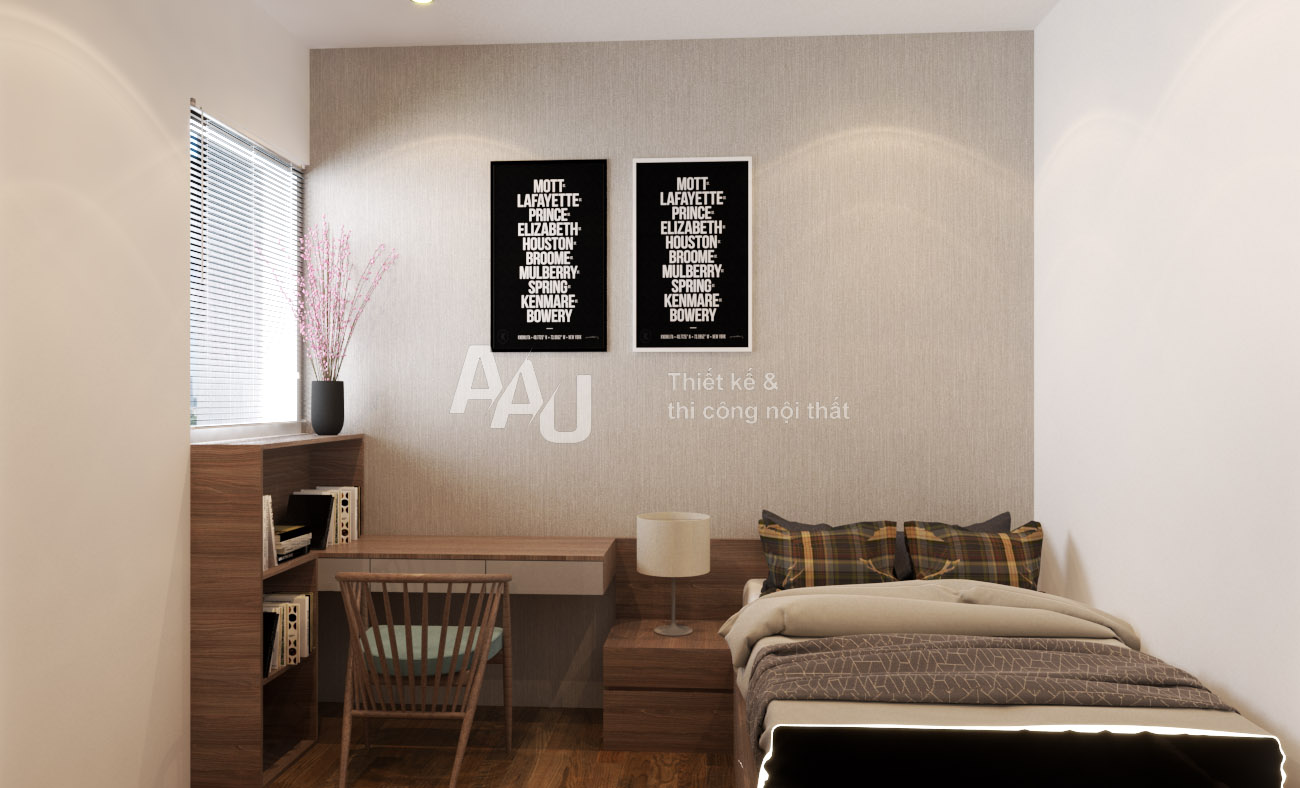 Phòng ngủ số  có sự bố trí nội thất gọn gàng và ngăn nắp. Giường ngủ nhỏ bên cạnh bàn làm việc và cửa sổ được bố trí thông minh, khoa học. Nội thất gỗ giúp căn phòng trở nên ấm cúng và gần gũi hơn.