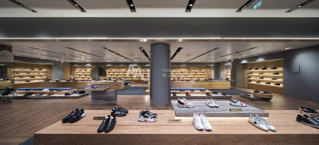 Gỗ là vật liệu chủ đạo được ưa chuộng trong những mẫu thiết kế shop giày mang phong cách hiện đại bởi có thể chế tác được nhiều kiểu dáng, đồng thời bản chất màu vân gỗ đã mang đến sự sang trọng mà không cần phải sơn thay đổi. Ngoài gỗ thì một số vị trí sử dụng kính cường lực, inox và sắt…