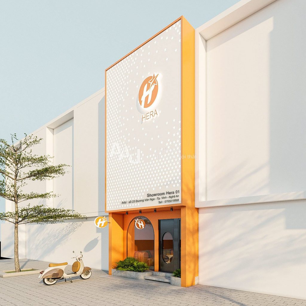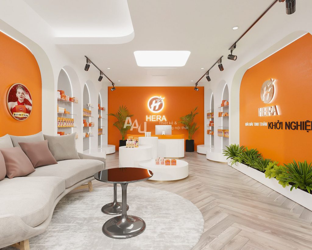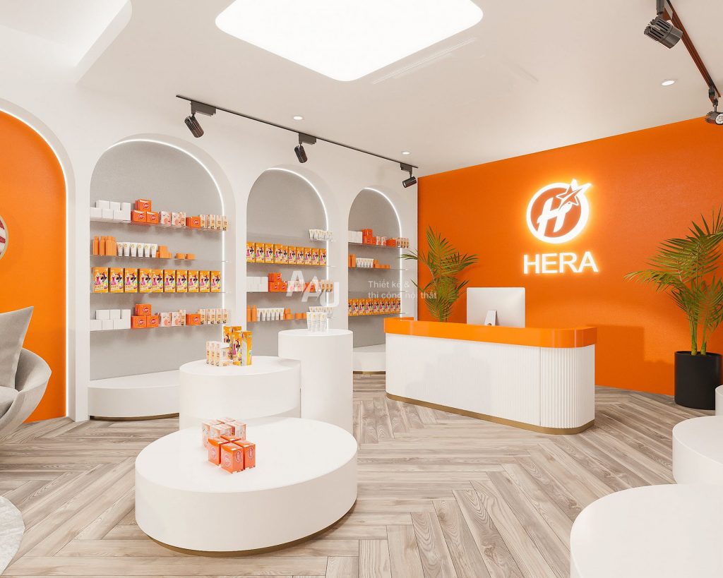 Khi làm một dự án thiết kế shop mỹ phẩm thì cái nhìn đầu tiên rất quan trọng, nếu kiến trúc sư có thể thiết kế một sản phẩm gây thu hút thì coi như thành công được một nửa. Có thể nói shop mỹ phẩm Hera đã tạo cho khách hàng sự thiện cảm ban đầu với lối thiết kế mang phong cách tân cổ điển, sử dụng gam màu cam, trắng làm chủ đạo. Phối hợp một cách hài hòa giữa tên thương hiệu và logo màu cam nổi bật trên nền trắng được đặt trang nghiêm trên một tấm pano khổng lồ mà không ai có thể phớt lờ.